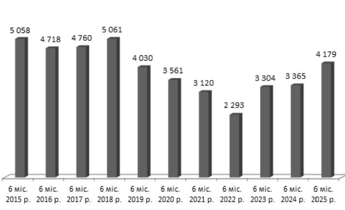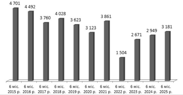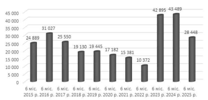 Рис. 20. Кількість кримінальних правопорушень у сфері господарської діяльності, облікованих в Україні за 1 півріччя у 2015–2025 рр.