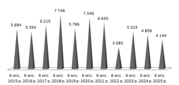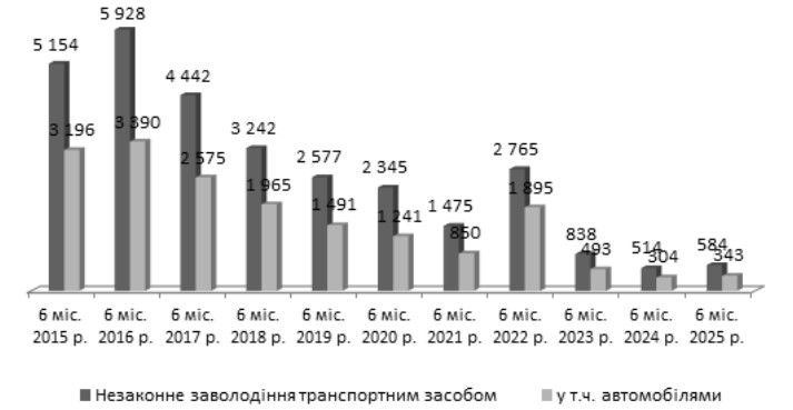 Рис. 19. Кількість випадків незаконного заволодіння транспортними засобами, облікованих в Україні за 1 півріччя у 2015–2025 рр