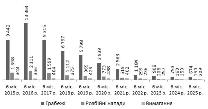 Рис. 17. Кількість грабежів, розбійних нападів та випадків вимагання, вчинених в Україні за 1 півріччя у 2015–2025 рр