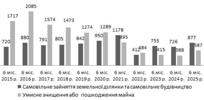 У 1-му півріччі 2025 р. відбулося підвищення – на 20,8% – кількості випадків самовільного зайняття земельної ділянки та самовільного будівництва (ст. 197-1), яка дорівнювала 877 (1 півр. 2024 р.: 726; –3,8%) (рис. 18). Окрім того, слід зазначити, що вперше за останні 5 років відбулося зростання чисельності фактів умисного знищення або пошкодження майна (ст. 194). Впродовж січня–червня 2025 р. зафіксовано 587 таких посягань (+51,3%) (1 півр. 2024 р.: 388; –6,5%).