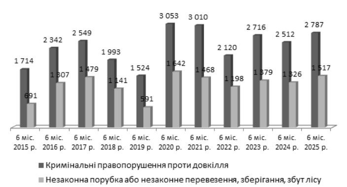 Рис. 21. Кількість кримінальних правопорушень проти довкілля, у тому числі випадків незаконної порубки або незаконного перевезення, зберігання, збуту лісу, облікованих в Україні за 1 півріччя у 2015–2025 рр