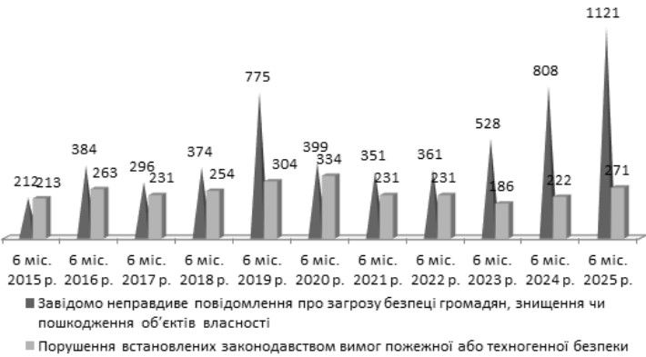 Рис. 23. Кількість випадків завідомо неправдивого повідомлення про загрозу безпеці громадян, знищення чи пошкодження об’єктів власності, а також порушення встановлених законодавством вимог пожежної безпеки, облікованих в Україні за 1 півріччя у 2015–2025 рр.