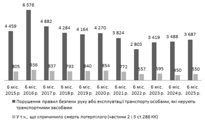 Знову зросла, хоча й незначним чином, чисельність випадків порушення правил безпеки дорожнього руху або експлуатації транспорту особами, які керують транспортними засобами в стані сп’яніння (ст. 286-1). Впродовж 1-го півріччя 2025 р. встановлено 470 таких діянь (+3,1%) (1 півр. 2024 р.: 456; +13,4%).