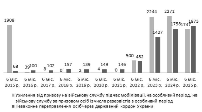 Упродовж першого півріччя 2025-го вперше за воєнні роки відбулося скорочення чисельності кримінальних правопорушень у сфері охорони державної таємниці, недоторканності державних кордонів, забезпечення призову та мобілізації. Було зафіксовано 4 008 таких діянь, що менше аналогічного показника попереднього року на 8,2% (1 півр. 2024 р.: 4 367; +15,4%).
