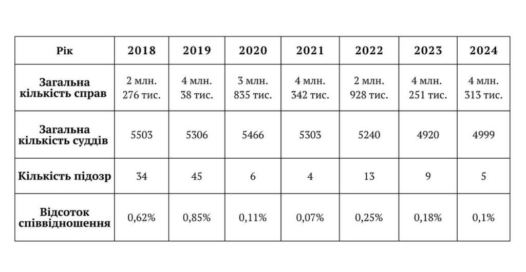 Також в статті наведена таблиця відсоткового співвідношення кількості суддів до кількості підозр: