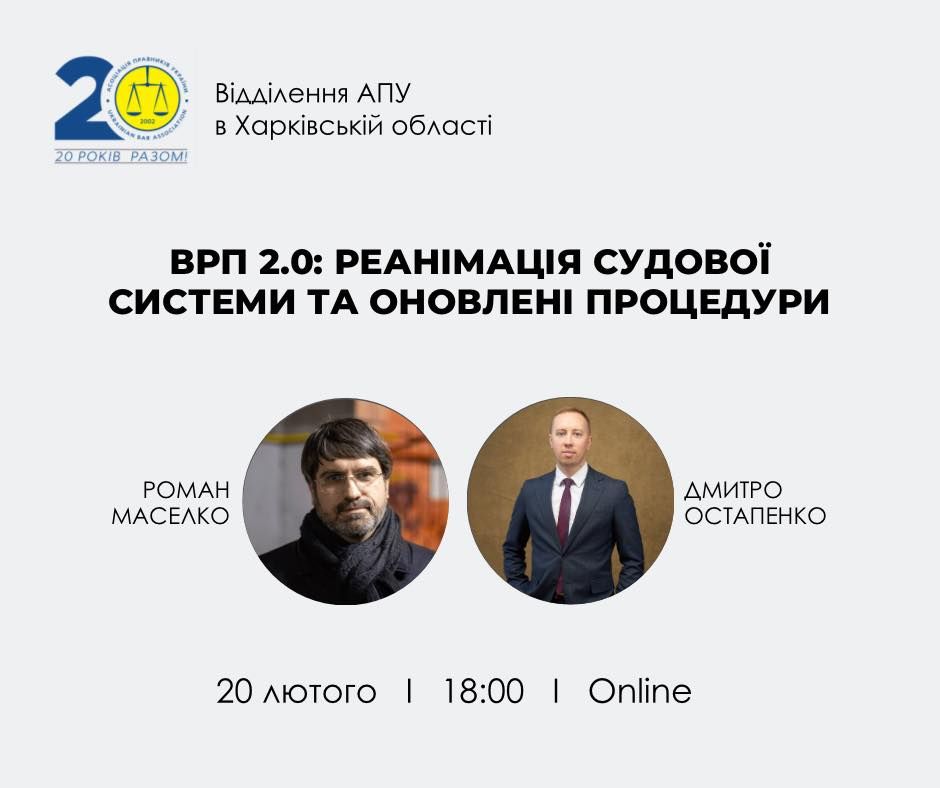 Відділення Асоціації правників України в Харківській області запрошує до участі в онлайн-зустрічі «ВРП 2.0: реанімація судової системи та оновлені процедури», яка відбудеться 20 лютого 2023 року о 18:00 на платформі Zoom.