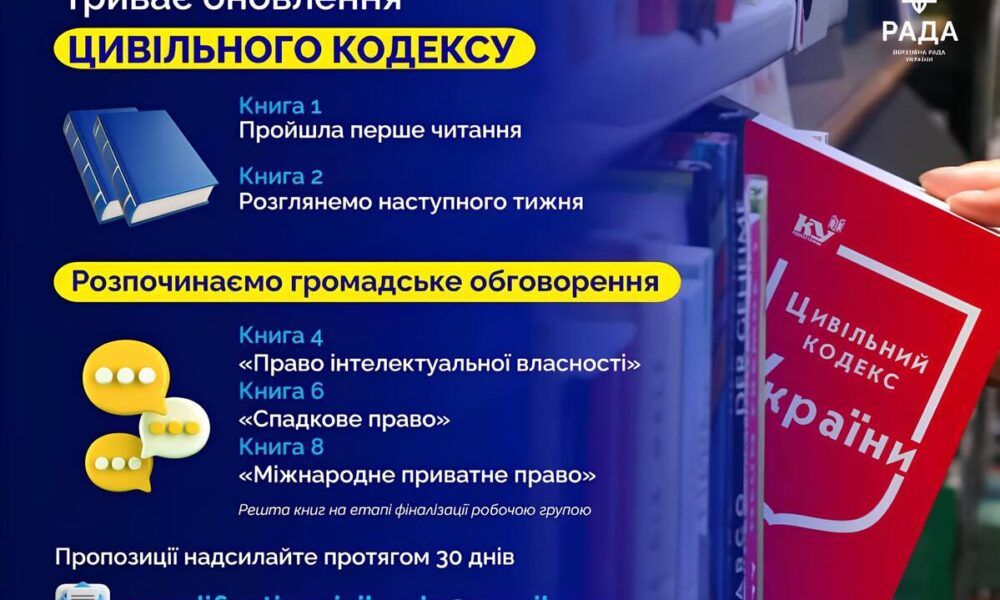 Верховна Рада України опублікувала для обговорення проекти трьох книг Цивільного кодексу: – книга 4 «Право інтелектуальної власності»; – книга 6 «Спадкове право»; – книга 8 «Міжнародне...