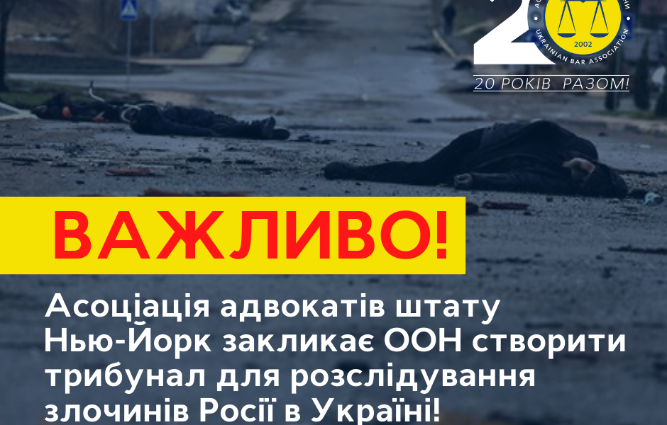 Асоціація адвокатів штату Нью-Йорк (New York State Bar Association, NYSBA) першою, серед міжнародних юридичних організацій, підтримала створення трибуналу для розслідування воєнних злочинів, скоєних Російською Федерацією, включаючи, але не...