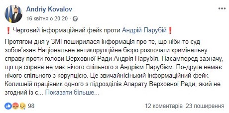 В останньому повідомленні джерелом «викривальної» і «фейкорозвінчувальної» інформації вказано FB-сторінку Андрія Ковальова – прес-секретаря Голови ВР, та поміщено посилання на його пост, оздоблений червоними знаками оклику.