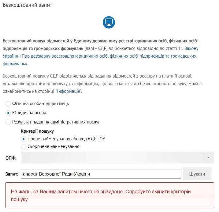 У державному бюджеті на 2019 рік виділено 1 964 043 100 грн на «Апарат Верховної Ради України» – юридичну особу, якої не існує, якщо вірити Єдиному державному реєстру юридичних осіб, фізичних осіб-підприємців та громадських формувань. Можна припустити, що такі кошти виділено не на юридичну особу, але як тоді вона ними розпоряджається?