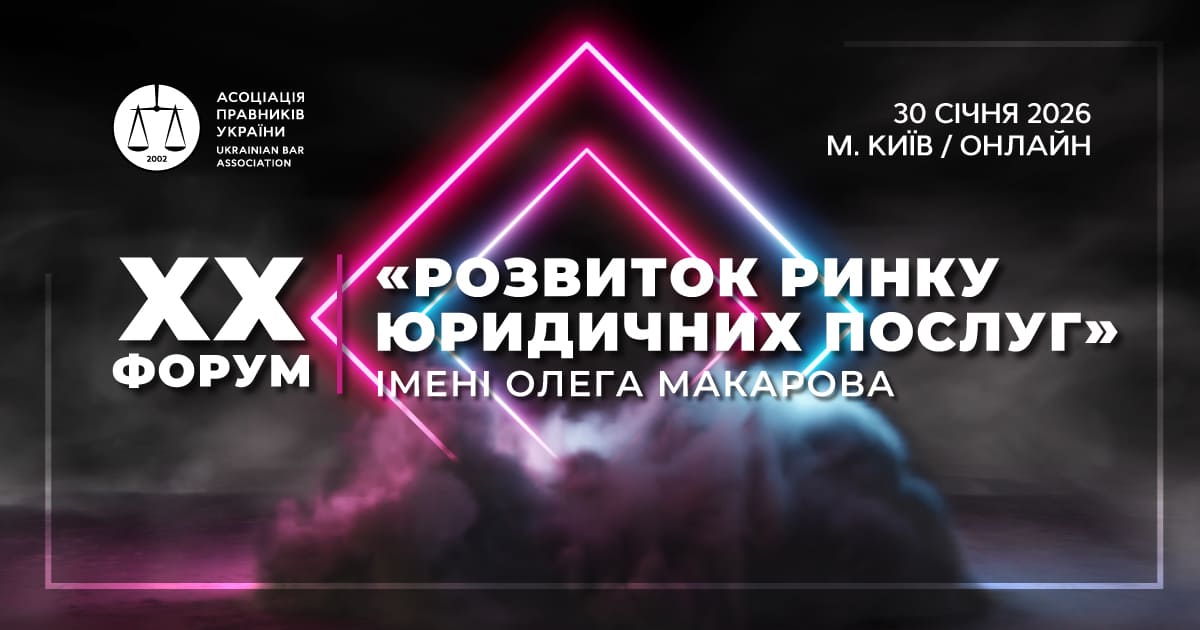 Асоціація правників України запрошує на ХХ Форум «Розвиток ринку юридичних послуг» імені Олега Макарова. Це щорічна подія Асоціації правників для керівників юридичного бізнесу, які відповідають за розвиток практик, команд і клієнтських відносин, а також для молодих правників, які прагнуть розвивати лідерські, управлінські навики та переймати кращий досвід.