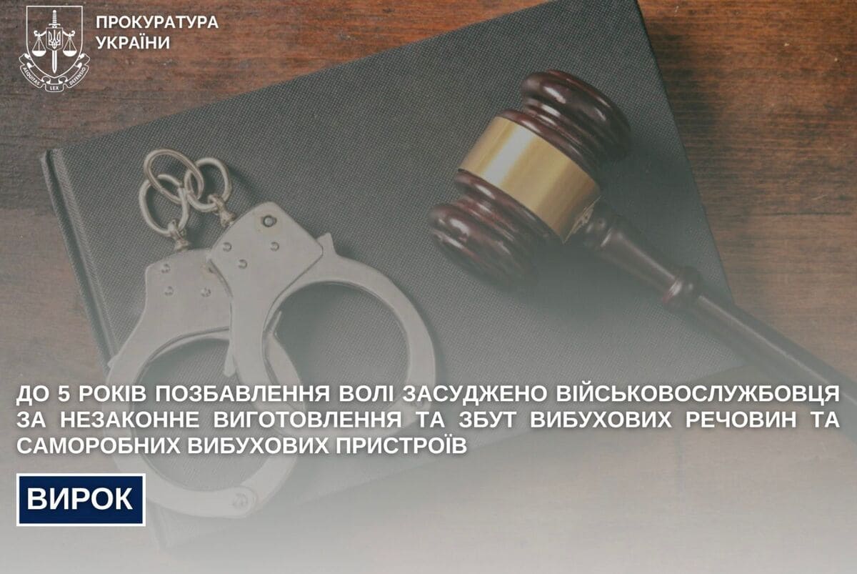 До 5 років позбавлення волі засуджено військовослужбовця за незаконне виготовлення та збут вибухових речовин та саморобних вибухових пристроїв