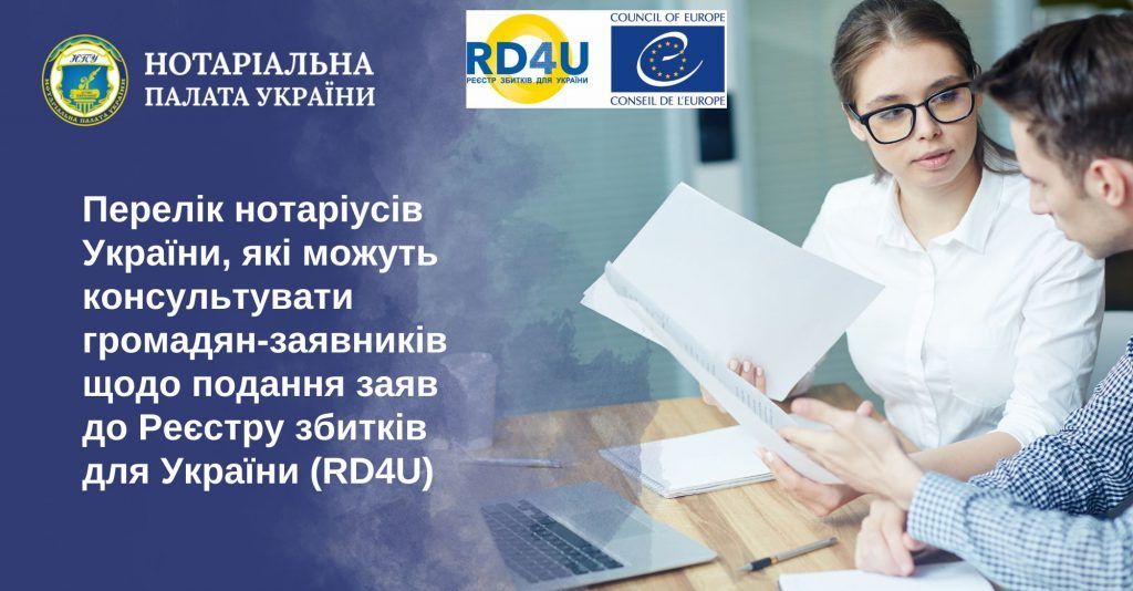 На сайті Реєстру збитків для України (RD4U) розміщено Перелік нотаріусів (за регіонами), які виявили готовність консультувати громадян-заявників щодо подання заяв до Реєстру.