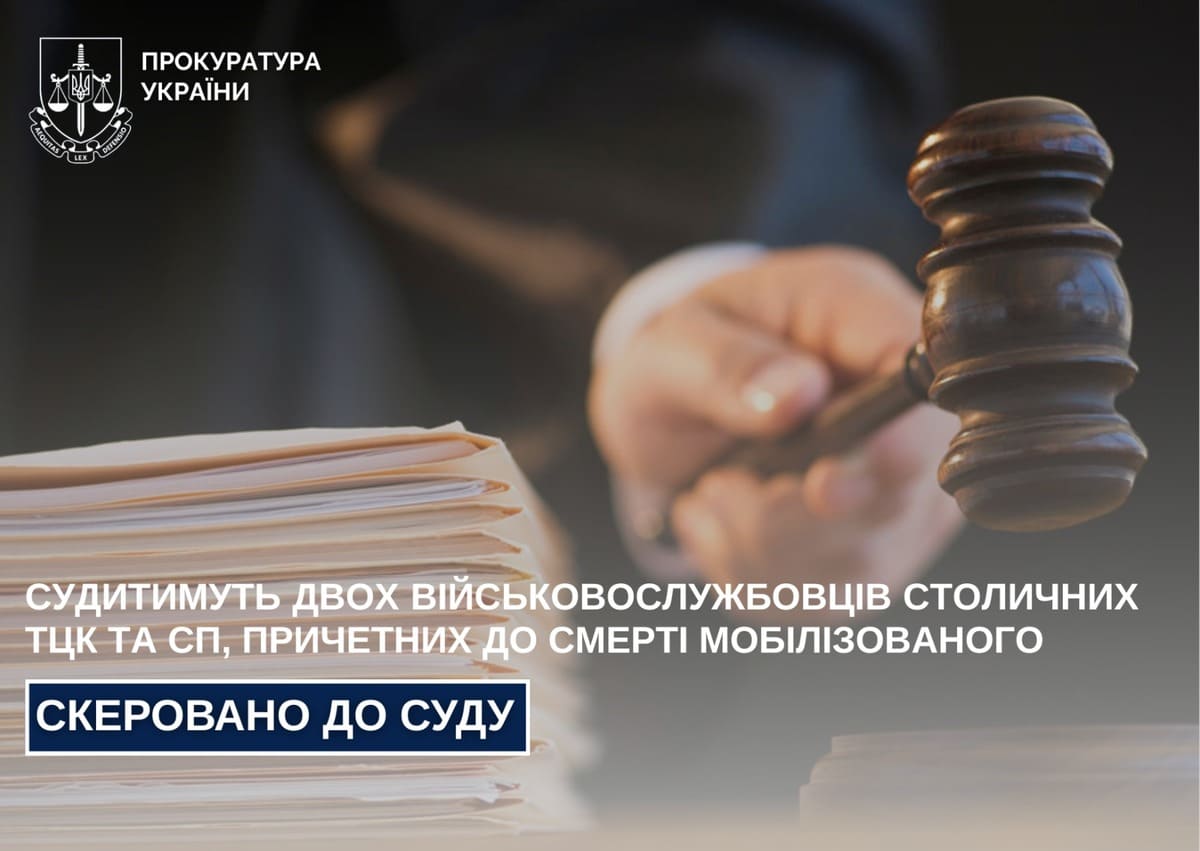 Прокурорами Дарницької спеціалізованої прокуратури у сфері оборони Центрального регіону до суду скеровано обвинувальний акт стосовно військовослужбовця столичного РТЦК та СП за фактом перевищення службових повноважень, що спричинило тяжкі наслідки, вчиненого в умовах воєнного стану, та умисного заподіяння тяжких тілесних ушкоджень, що спричинили смерть потерпілого (ч. 5 ст. 426-1, ч. 2 ст. 121 КК України) та заступника начальника одного з РТЦК та СП міста Києва за фактом умисного неприпинення кримінального правопорушення, що вчиняється підлеглим, що спричинило тяжкі наслідки, вчиненого в умовах воєнного стану (ч. 4 ст. 426 КК України).