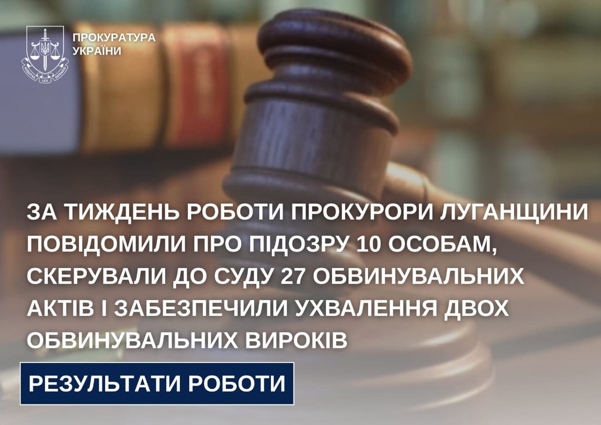 За тиждень роботи прокурори Луганщини повідомили про підозру 10 особам, скерували до суду 27 обвинувальних актів і забезпечили ухвалення двох обвинувальних вироків